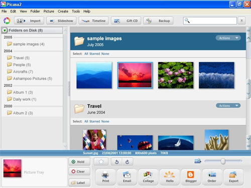 Программа "Picasa" позволяет организовывать, изменять и загружать фотографии с помощью простых и быстрых действий. Очень приятный дизайн. "Picasa" вполне может заменить более известную ACDSee, к которой привыкло большинство из нас. С помощью "Picasa" можно создавать фотоальбомы, с подписями к каждой фотографии. Встроенный редактор не слишком сложный, но основные операции по корректировке изображения и простейшие спецэффекты делать позволяет. Можно на основе выбранных фотографий сделать коллаж или заставку экрана. Это только маая часть возможностей программы.