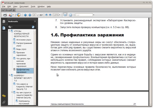 "Adobe Reader" - программа, предназначенная для просмотра и печати документов в формате PDF. Формат PDF (Portable Document Format) является одним из самых распространённых и удобных форматов для электронного представления различной документации. В этом формате можно встретить файлы справки, руководства пользователя, описание различных программных продуктов, рекламные буклеты и т.д. Кроме того, "Adobe Reader" умеет работать как плагин к различным браузерам и может показывать слайд-шоу в формате Adobe Photoshop Album, просматривать Flash-видео, внедренное в документы PDF. Еще "Adobe Reader" поддерживает новый сервис Acrobat.com, созданный для упрощения совместной работы над документами. Пользователи, в частности, могут выполнять конвертирование документов онлайн, используя данную программу. Обязательно должна быть установлена на каждом компьютере.