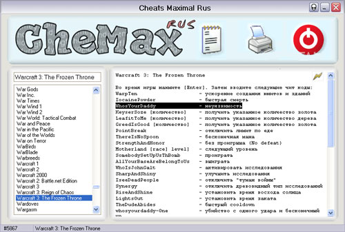 Прекрасная программа в коллекцию любителям поиграть. "CheMax" представляет собой огромную русскоязычную базу с кодами для игр. Очень приятный интерфейс и удобный поиск. В базе данных на сегодняшний день более 6100 игр. Теперь ни что не помешает вам победить всех своих врагов. Эх, вот бы в реальной жизни так: раз, и у тебя бесконечная жизнь; два, и ты можешь ходить сквозь стены...мда-а.