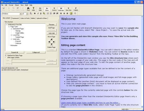 Необычная программа, предназначенная для создания не отдельных веб-страниц, а целых сайтов. Сначала дизайнер должен построить структуру будущего сайта, затем выбрать дизайн, модифицировать его по своему вкусу и внести специфичные для сайта данные. Наконец, последний этап работы — генерация сайта. Разумеется, отдельные страницы можно дорабатывать и после этого. Опытный веб-дизайнер с помощью "SiteGenWiz" сможет значительно упростить свою работу, а дополнительные настройки помогут создать неповторимый сайт.