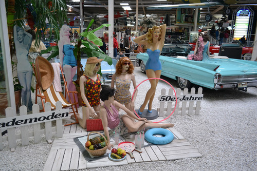 Все это разделено более-менее по периодам: 20-е годы, 30-е, 50-е. Между машинами расставлены и манекены, одетые в одежду соответствующего времени, плюс всевозможные сопутствующие аксессуары.