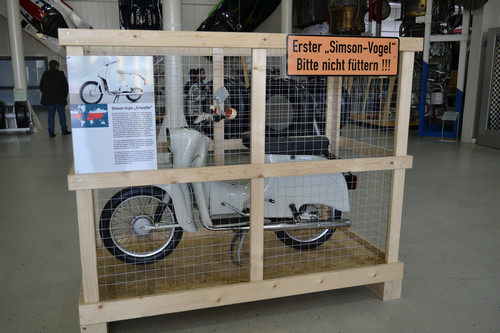 Кстати, на входе еще видели первый (созданный в 1961 г.) мопед класса "Simson-Vogel" (Симсон-птичка), посаженный в клетку, на которой висит табличка с надписью: "Первая "Симсон-птичка". Пожалуйста не кормить!!!"