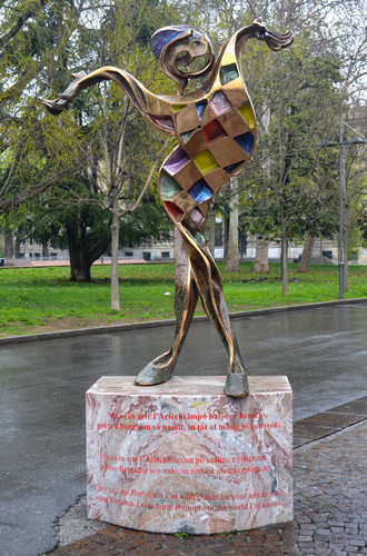 Спустившись пешком со стен в нижний город, мы отправились в сторону вокзала, откуда должны были на электричке ехать в Милан. На подходе к вокзалу увидели скульптуру, о которой читали перед поездкой: Труффальдино или Арлекин.