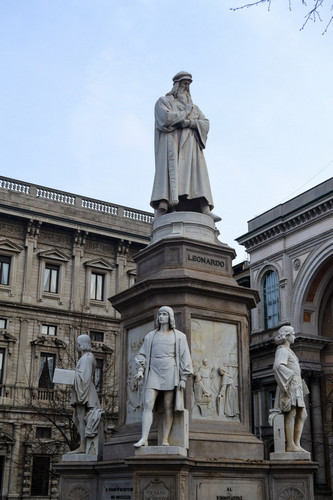 В центре площади Ла Скала стоит памятник Леонардо да Винчи в окружении своих последователей.