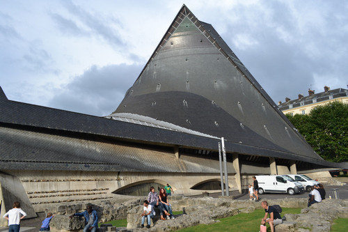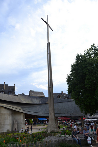 Странная форма крыши должна символизировать по задумке архитектора языки пламени, в которых погибла Жанна, как мы прочитали. Не знаю, но на пламя крыша похожа мало. Скорее на хребет гигантского динозавра. Хотя, искусство - дело тонкое. Может быть, художник именно так себе это видел. Во всяком случае, постройкой этого сооружения городские власти убили сразу нескольких зайцев: во-первых, город получил церковь, посвященную Жанне Д'Арк; а, во-вторых - место для хранения витражей из разрушенной в 1944 году церкви Сен-Венсан. В саму церковь мы, правда, не попали, потому об ее убранстве ничего сказать не могу.
