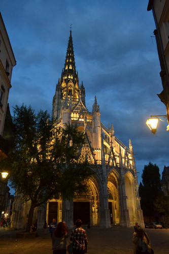 Пока бродили по улочкам города, опустился вечер. Включилась подсветка и все стало совсем другим, не таким, как виделось днем. Когда вышли к зданию муниципалитета, увидели примкнувшую к нему Церковь Сент-Уэн. Эта церковь и так не маленькая, а в сумраке вообще кажется просто безразмерным монстром (в хорошем смысле этого слова).