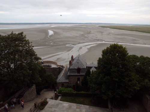 Бесконечное песчаное море от края до края - глаз не оторвать. Если приглядеться, то можно рассмотреть далеко впереди маленькие черные точки - туристов рискнувших прогуляться по обнажившемуся морскому дну. Тут это советуется делать только с гидом, который знает точное время приливов и отливов, а еще в курсе о зыбучих песках, которые около Мон-Сен-Мишель так же не редкость.