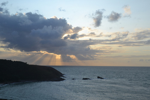 Оно опускалось очень медленно, словно позируя многочисленным фотографам, собравшимся тут и вместе с нами наблюдавшими закат. То обнимая одним боком торчащую скалу, то обводя тонким светящимся контуром немногочисленные облака. И, в конце концов, плавно опустилось за кромку воды.