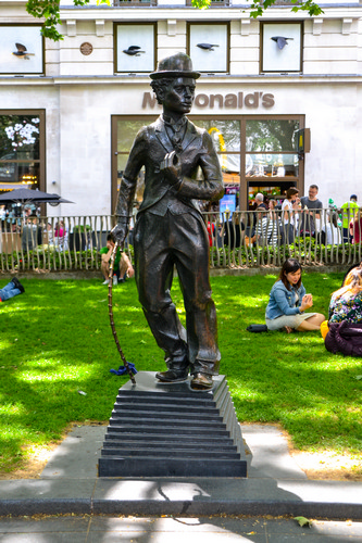 Сбоку от Шекспира, за одной из многочисленных скамеек на небольшом постаменте уютно устроился Чарли Чаплин.